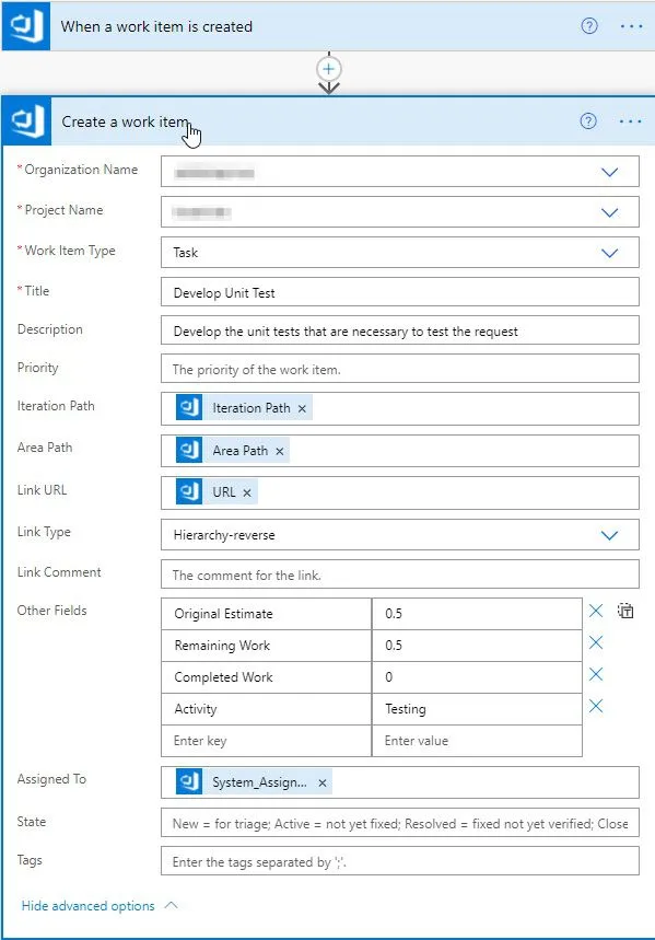 As you can see, the Flow is effortless, as well as the DevOps action configuration. We don’t need complex Flows to save us a lot of time. If you use DevOps, talk with your team and find areas where you can create tasks automatically. Every time Power Automate creates one; it's 2 minutes that you save your team. It quickly adds up, so keep these small increments in mind.