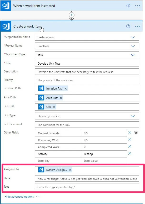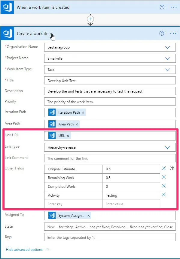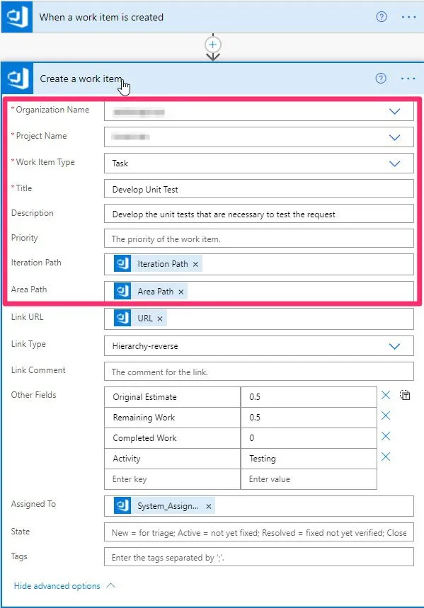 3. Other fields - This is the best part. We can already define some fields that can fill in automatically. In our case, we have the estimations and type of activity configured so that the task is as complete as possible. The estimate is defined in hours, and the activity should be present already in DevOps.