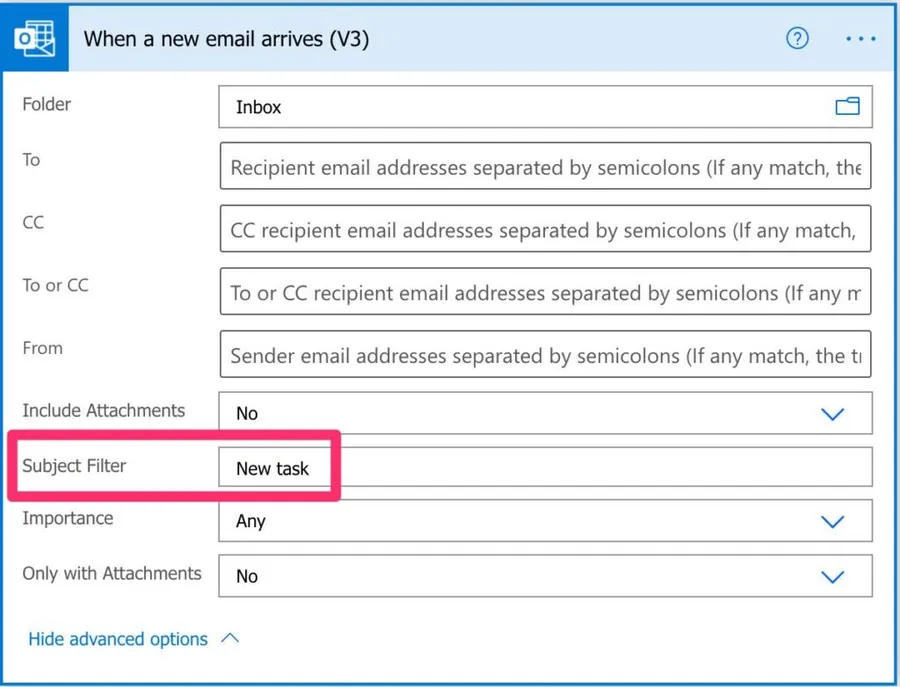 We will start with the “When a new email arrives” trigger. We’ll leave it as is, but you should look at the parameters if they need to be changed to fit your rules.