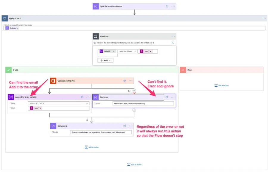 There's one point that I want to explain a bit more and that's the "Get user profile" action. The action will return an error if it can't find the person in the organization. Since any mail can be inserted we're checking if it fails and if it does ignore it. After that, we need a second "Compose" action so that, regardless if we have an error or not the "Apply to Each" action will continue. Otherwise, we'll go into the right branch but since there was an error the Flow will fail regardless.