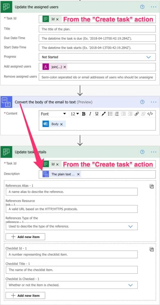 - The body of the email is the description, but first, we’ll convert the HTML into text using the “HTML to Text” action.