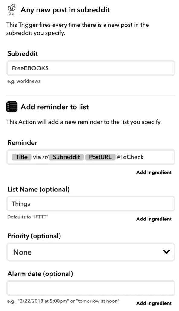 There’s a fantastic community on Reddit that posts free books from multiple sources, but mainly amazon, where you can get amazing books for free. If you have a Kindle, this is a the community to subscribe. Do yourself a favor and go, once in a while, to this community and get your free books. Unfortunately, Power Automate doesn’t support Reddit (hopefully yet), but I use IFTTT to deliver the new books automatically to my Reminders list. Then I pull them automatically to Things 3 and parse them. IFTTT removed the ability to share, but you can create your own effortlessly by following the steps and get something like this: