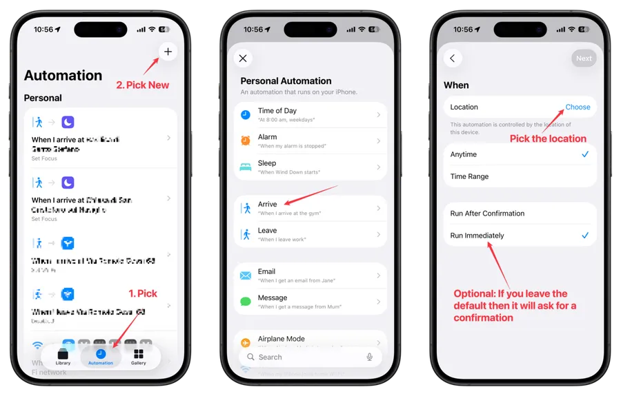 Let’s open Shortcuts, pick “Automation,” and tap “New.” Then pick “Arrive,” meaning that it will trigger once you arrive at a place, or near it, but more on that later.