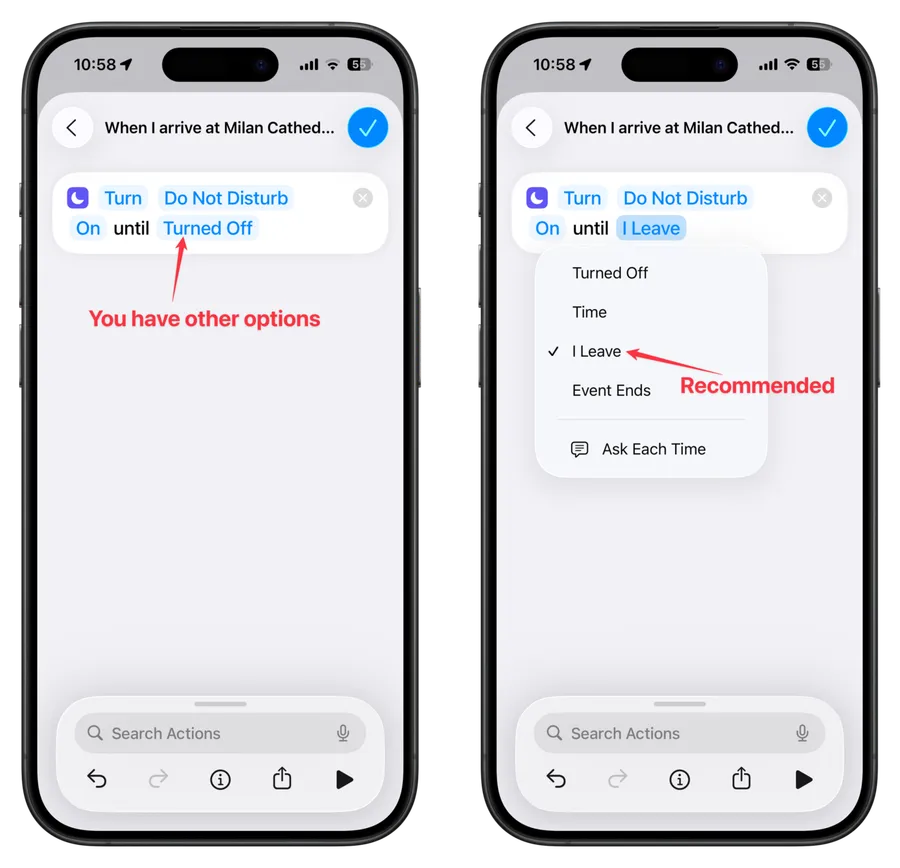 As you can see, you have an “until turned off” option, so we can quickly toggle it to be “until I leave.” It’s a lot simpler, and this way you can achieve everything with only one step.