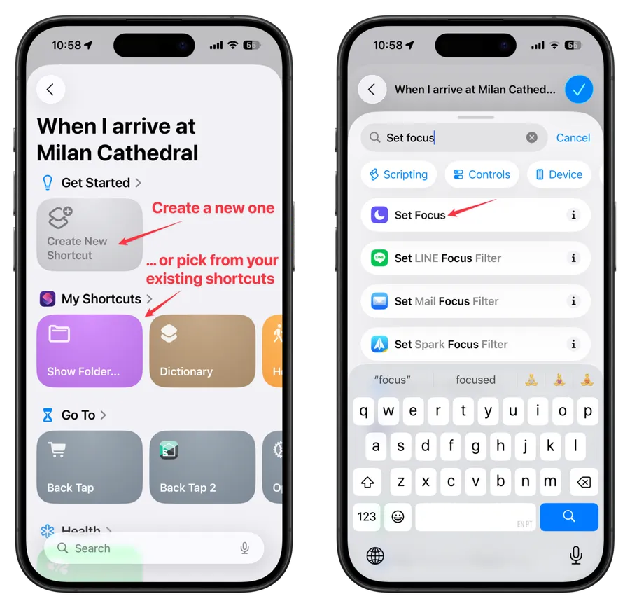 Then let’s search for “Set Focus.” Focus modes were introduced in iOS 15 back in 2021, but if you used an iPhone before, you may remember a “Do not disturb” mode only. We'll use “Do not disturb,” but you can use another mode by picking it from the menu.