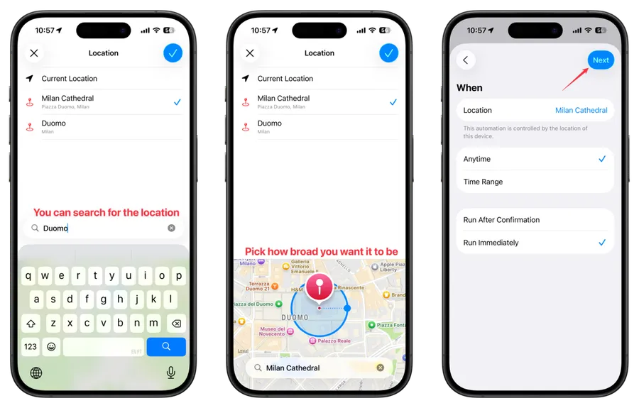 Let’s work on the location. If you’re building the shortcut on the location you want to trigger, then you can pick “current location,” and you’re good to go; otherwise, you can trigger it once you reach a specific place by picking/searching for the place in question.