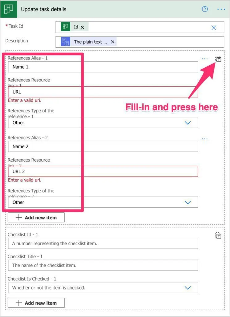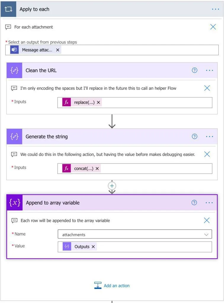 [su_panel text_align="center" radius="10" background="#D6DAC2" border="1px solid #E7E7E7"]I want to pause here to explain one important concept. Since we want to insert an unknown number of attachments, we need to build the structure to pass to the "Update task details" action. To do that, we'll use a strategy similar to adding checklist items but for attachments. You can check the details in my "Add planner checklist items dynamically" [/su_panel]
