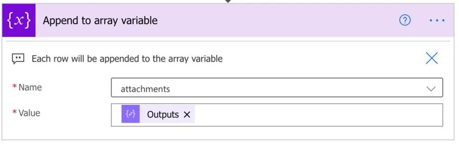 For the sake of simplicity, the first element and the last will always be the same. Since the attachments can be any type, we can add them as "Other," and all will work. Also, we can name them all the same not to make the Flow more complex than it needs to be. So we need a string like this:
