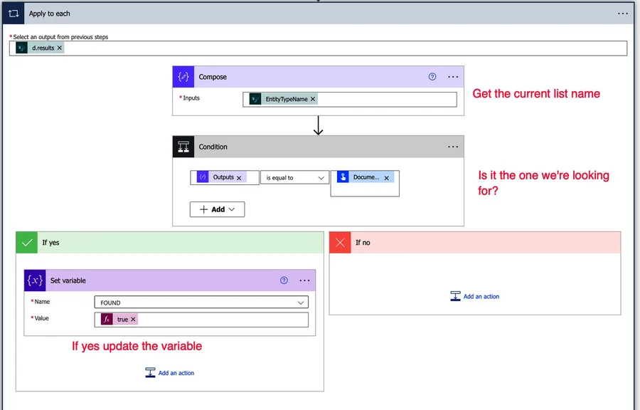 So now that we have the document libraries from SharePoint, we can filter the data and check if we can find the one we're looking for. If you skipped the previous section, you must know that we'll define the fields manually instead of picking them from the "dynamic content" tab. Here's an overview of the "apply to each" action.