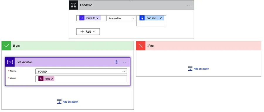If they are the same, it's already present on the SharePoint lists' objects. Therefore, we update the variable to "true" using the "true" function.