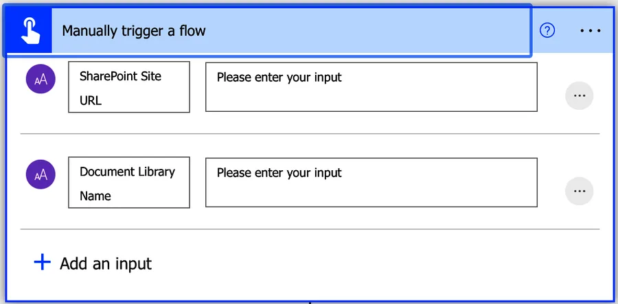 So let's start building the template. The main objective is, aside from finding a document library, to be able to use it in your tenant, hence the "Manually trigger a Flow" trigger and the “Respond to a PowerApp or flow”.