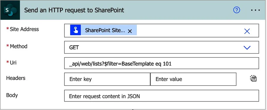 First, let's think about how to achieve this. SharePoint has a convenient action called "Send an HTTP request to SharePoint Action." It enables us to get information from SharePoint's API, even if there isn't an action available in Power Automate to do it.