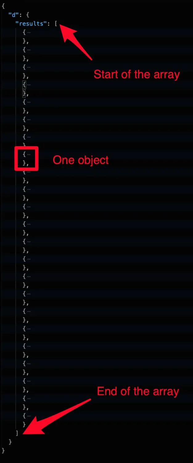 First, we'll need to go over all elements of the array. If you're not familiar with JSON, don't worry. I'll create a more in-depth explanation of it, but here's what you need to understand. When you have curly braces, you have an "object," in this case, a SharePoint list or document library to be more precise. Consider an object as group of key and values. For example, a "car", object can have the key "brand" with value "BMW" and the "color" key with the value "blue". When you have square braces, you know you'll have a list of objects, so in this case, a group of SharePoint lists. All of them are identified by a key. Consider the key as a way to tell Power Automate where to find the data.