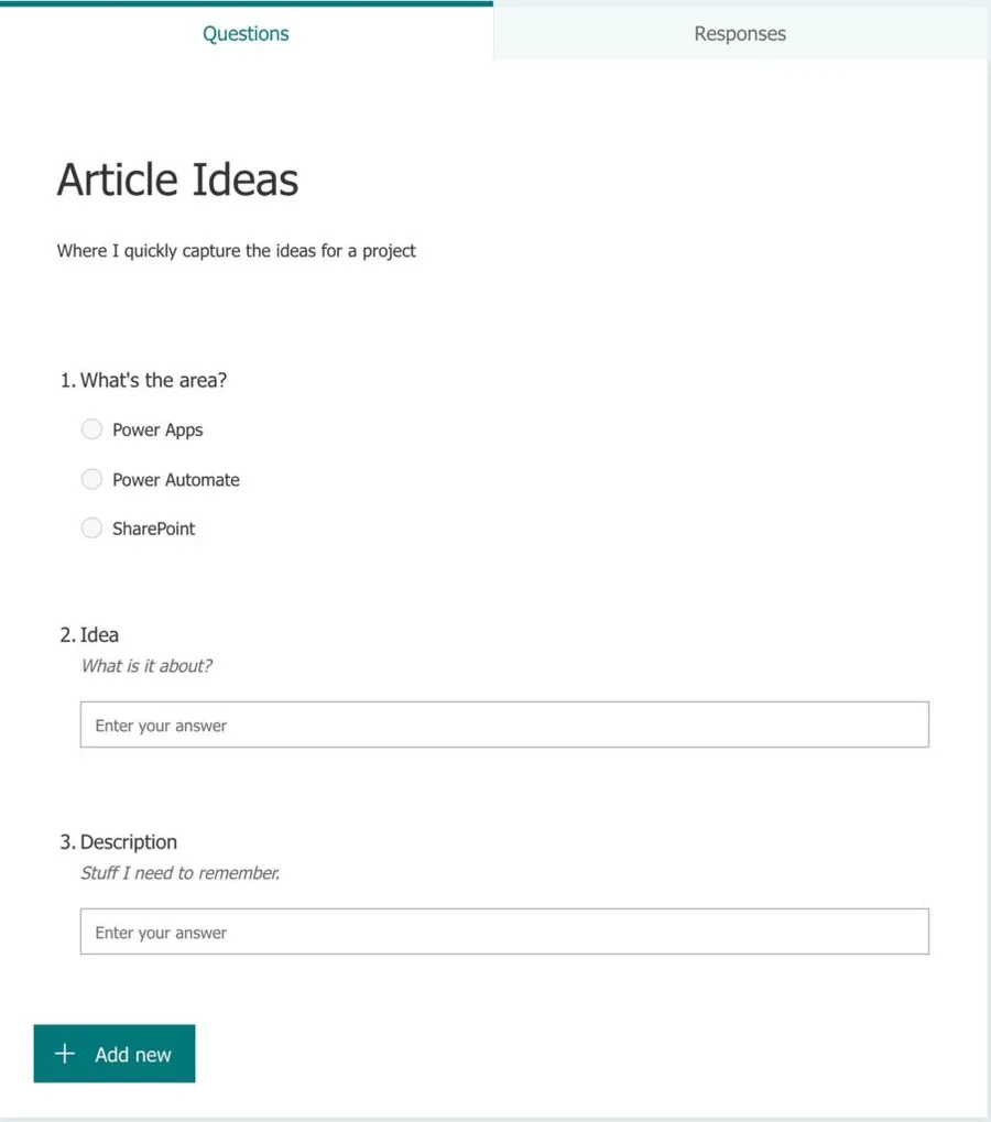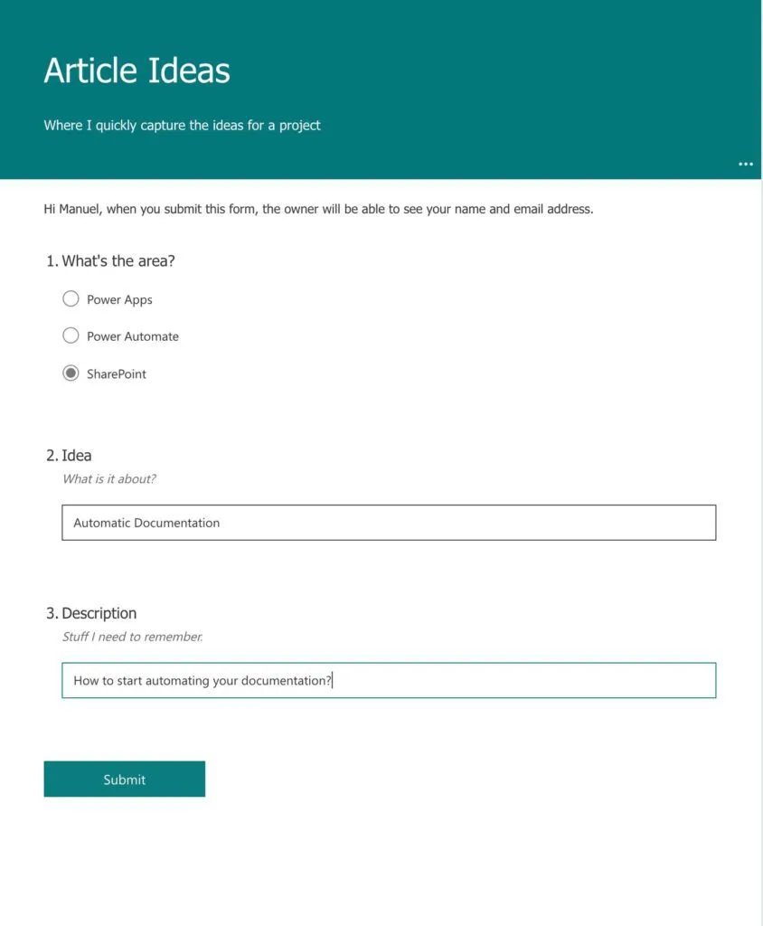 - Have a central point for submitting information. For example, if you have ideas for articles and have different sections, have a Power App, Microsoft Forms, or something else that can collect the ideas quickly.