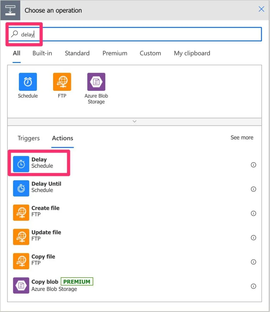 The "delay action" is in the “Built-in” tab inside the “Schedule” group: