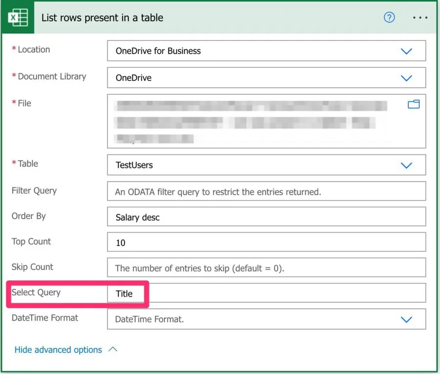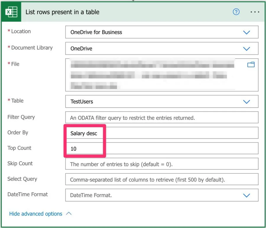 - Limit the columns that we want. We can also fetch only a set of columns, making the information easier to parse and the overall Flow faster to run.