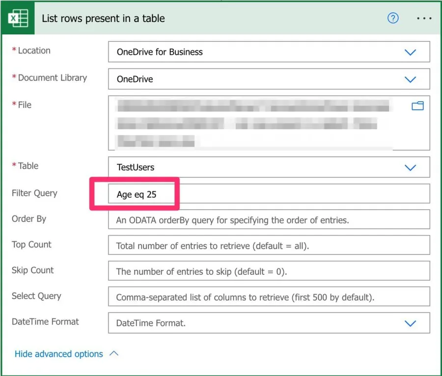 Let's look at an example. Let's say that we want to fetch people in the Excel file that are 25. Of course, we could bring the whole dataset and filter it, but it's a lot faster to build the OData query like this: