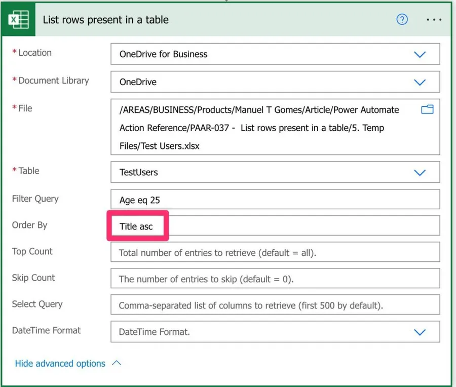 The way that Excel Online and Power Automate are integrated is quite impressive. We can do a lot with the actions that we have available, but focusing on this one, we can: