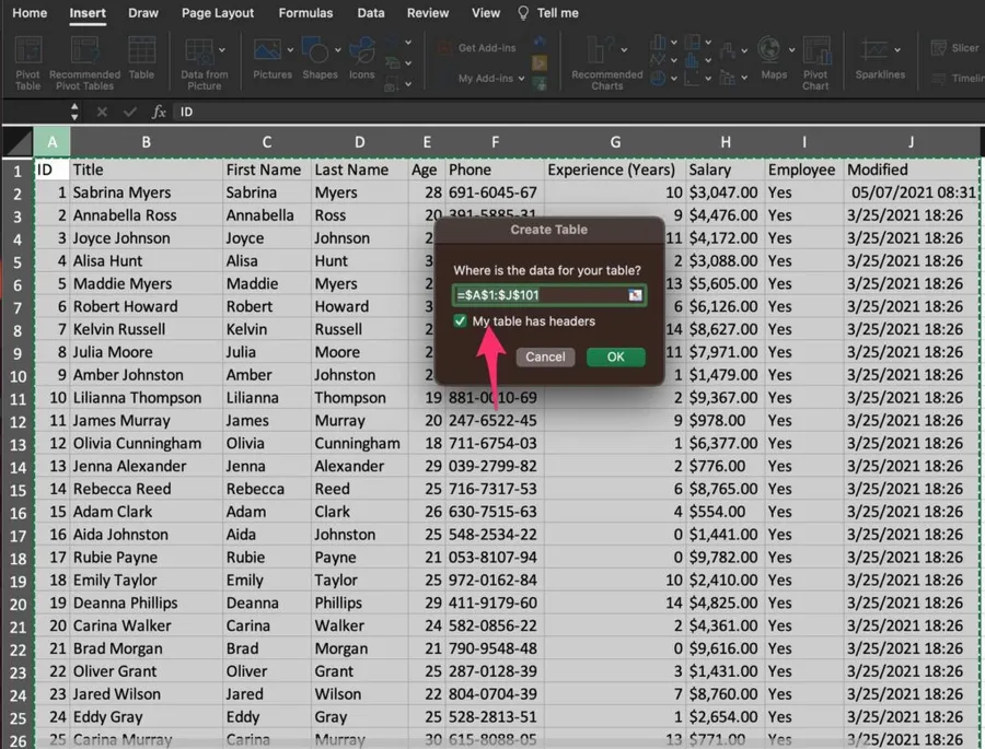 Here's how to do it. I'm using Excel for macOS, but it works the same way in the Windows version. So first, select the data.