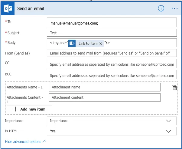 Quick and simple. I have an image in SharePoint; I fetch the URL, write the HTML, and define the email as HTML. But when I check the email, I get something like this: