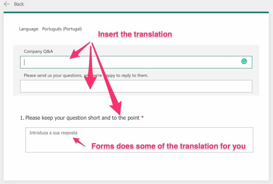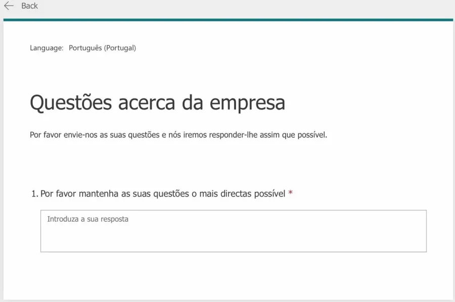 So far, so good, but what if I want my Portuguese compatriots to answer and see in Portuguese? You “just” need to insert the translation for that form and it will be displayed in the language chosen. For that, let’s go back to the language that we selected previously: