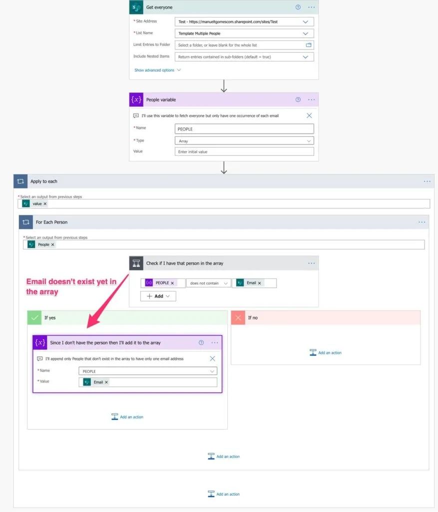 Since we have multiple items in the SharePoint list, we need an “Apply to each” action to iterate them. But notice that we defined the column “People” as “Allow Multiple Selections”, so we can have several items on that column per record. So we need to: