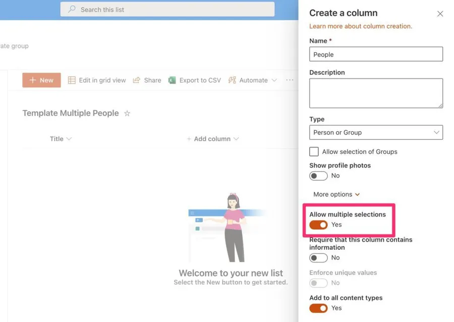 Let’s create a simple SharePoint list that contains a column for “People” as below: