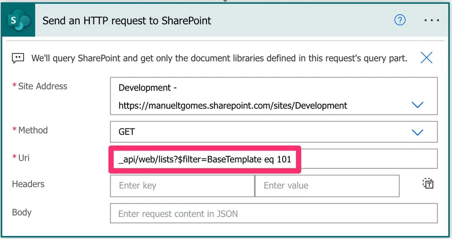 Now that we know what we’re looking for let’s make the request. As mentioned, we will use the “Send an HTTP request to SharePoint” action. This action will allow us to build a URL, send it to SharePoint , and get the information back. So let’s see what we can do: