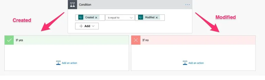 We have two columns ("Created" and "Modified") that SharePoint updates automatically. They contain the date that the item was "Created" and when it was last "Modified." Please note that SharePoint also considers something as "modified" when an item is created, so both dates are the same when it happens. So we can use a simple "Condition" action to check this: