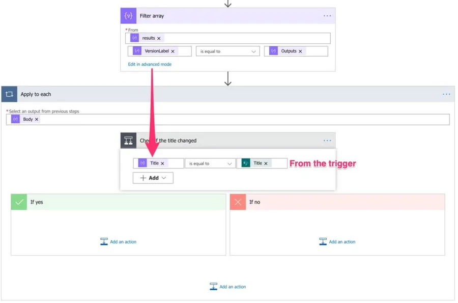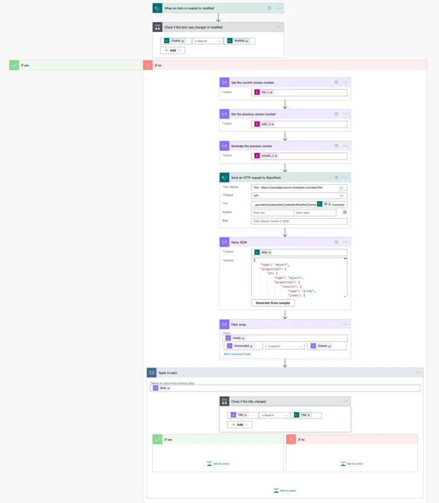 Now that we have done all our homework, it's easy to check what changed. We have the previous data and the current version, so you only need "Condition" actions to compare the data. For example: