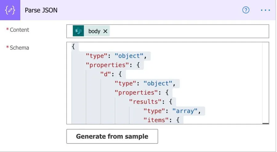 [su_panel text_align="center" radius="10" background="#D6DAC2" border="1px solid #E7E7E7”]Pro Tip: To generate the structure run your Flow once and get the result from the “Send an HTTP request to SharePoint” action. Copy that and paste it into the "generate from the sample" in the "Parse JSON" action, and Power Automate will do all the work for you.[/su_panel]