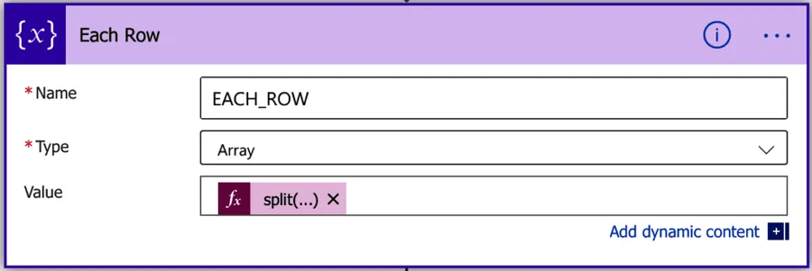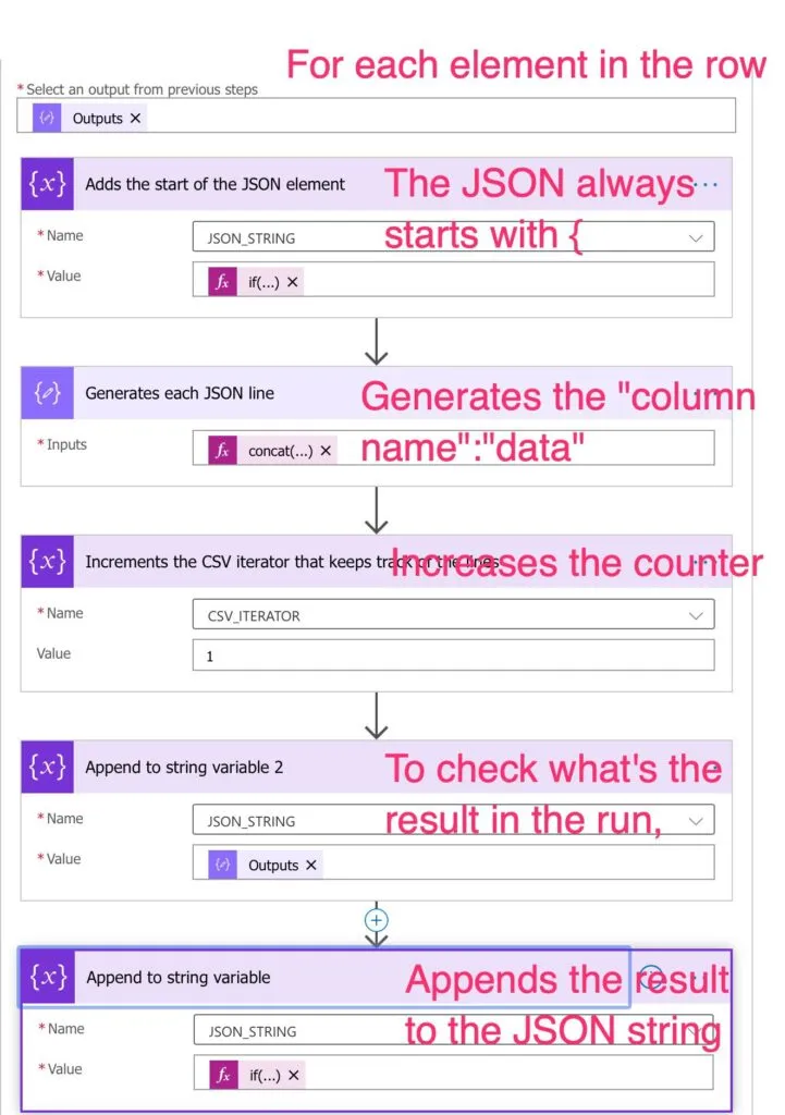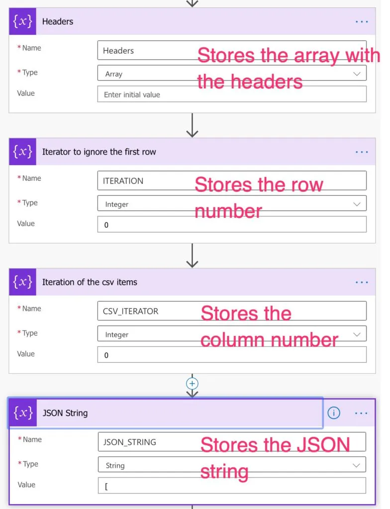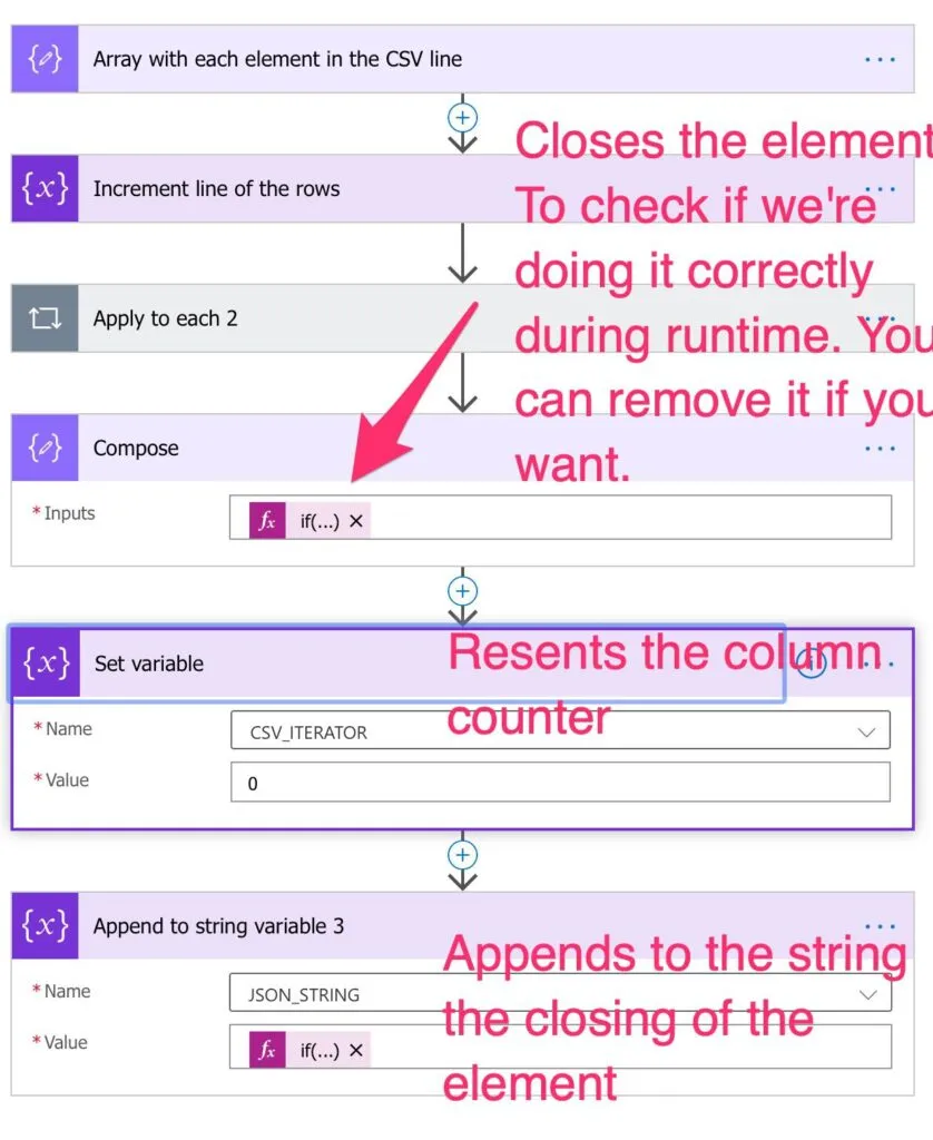 If anyone wants a faster & more efficient flow for this, you can try this template: https://powerusers.microsoft.com/t5/Power-Automate-Cookbook/CSV-to-Dataset/td-p/1508191 And if you need to move several thousands of rows, then you can combine it with the batch create method: https://youtu.be/2dV7fI4GUYU Together these methods could move 1000 CSV rows into SharePoint in under a minute with less than 30 actions, so you don’t waste all your account’s daily api-calls/actions on parsing a CSV.