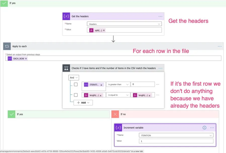 Hi James, Does your previous step "split(variables('EACH_ROW')[0],',')" returns an array? Can you please check if the number of columns matches the number of headers. For example: Header 1, Header 2, Header 3 row 1, row 2 The condition will return false in that step. What steps does 2 things: 1. Checks if there are headers 2. Checks if the header number match the elements in the row you're parsing. Can you please take a look and please let me know if you can fix the issue? Cheers Manuel