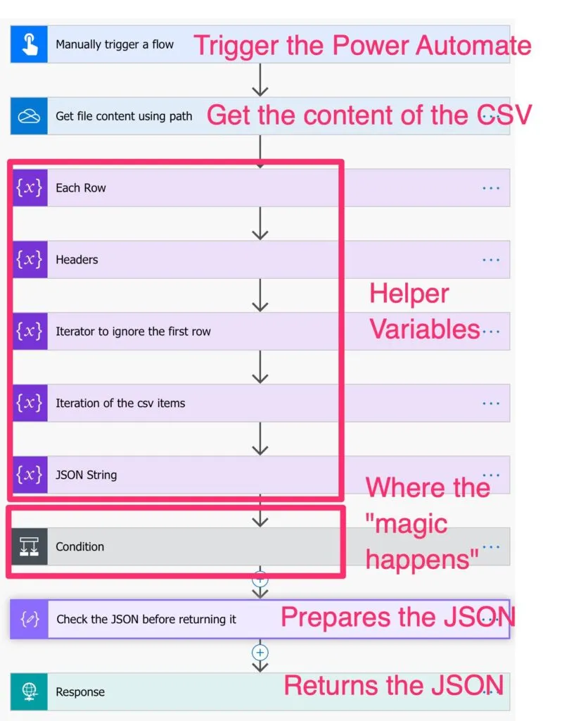 Hi Manuel, I have followed this article to make this flow automate. Here is scenario for me: Drop csv file into Sharepoint folder so flow should be automated to read csv file and convert into JSON and create file in Sharepoint list. Everything is working fine. CSV is having more than 2500 rows so when I am testing this with till 500 rows then it is taking time but working perfectly. But when I am going to test this flow with more than 500 records like 1000, 2000 or 3000 records then flow is running all time even for days instead of few hours. Lastly, canceled the flow because it is running for days and not completed the flow. Message had popped at top of the flow that: "Your flow's performance may be slow because it's been running more actions than expected since 07/12/2020 21:05:57 (1 day ago). Your flow will be turned off if it doesn't use fewer actions.Learn more" Learn More link redirecting to me here: https://docs.microsoft.com/en-us/power-automate/limits-and-config Would you like to tell me why it is not working as expected if going to test with more than 500 rows? Thanks.