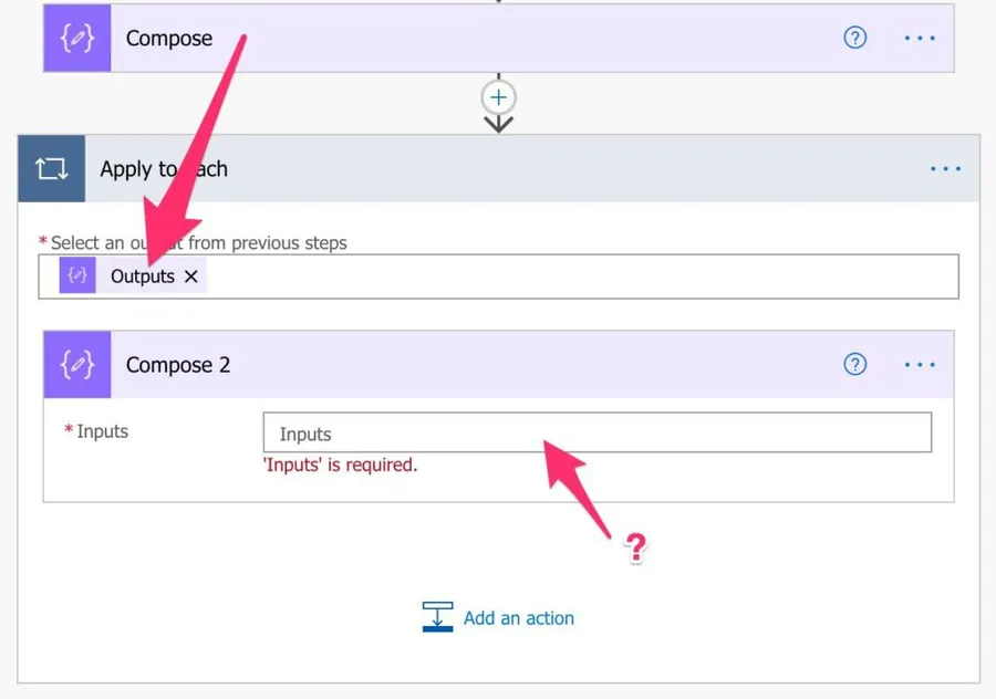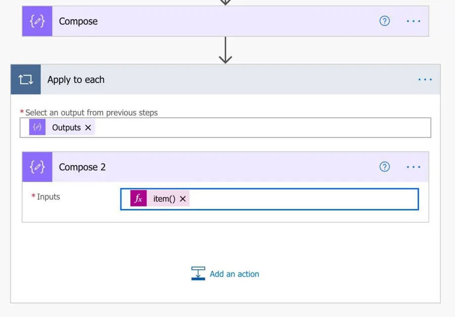 It may look strange, but this is an excellent way to look at the “run history” and see the values before I do something with them. I call this a “debug compose”, and the item function can be used for this purpose. This way, you’ll have the array element or object and see the values in each position of the Apply to Each action, making debugging a lot simpler.