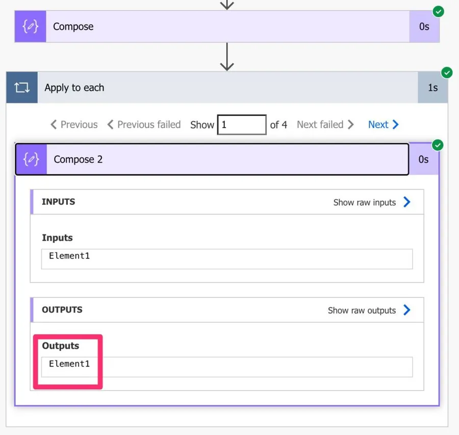 We have an array with 5 elements, so not let’s do an Apply to Each action to see the result.
