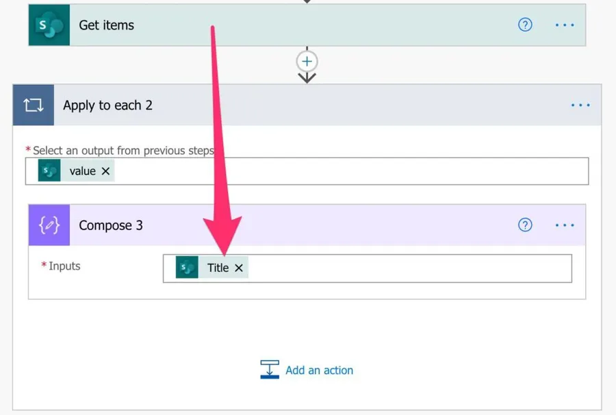 Let’s use a Get Item Action and fetch a bunch of items in a SharePoint list. If we use the same strategy above with the Apply to Each and the item function, we get the following: