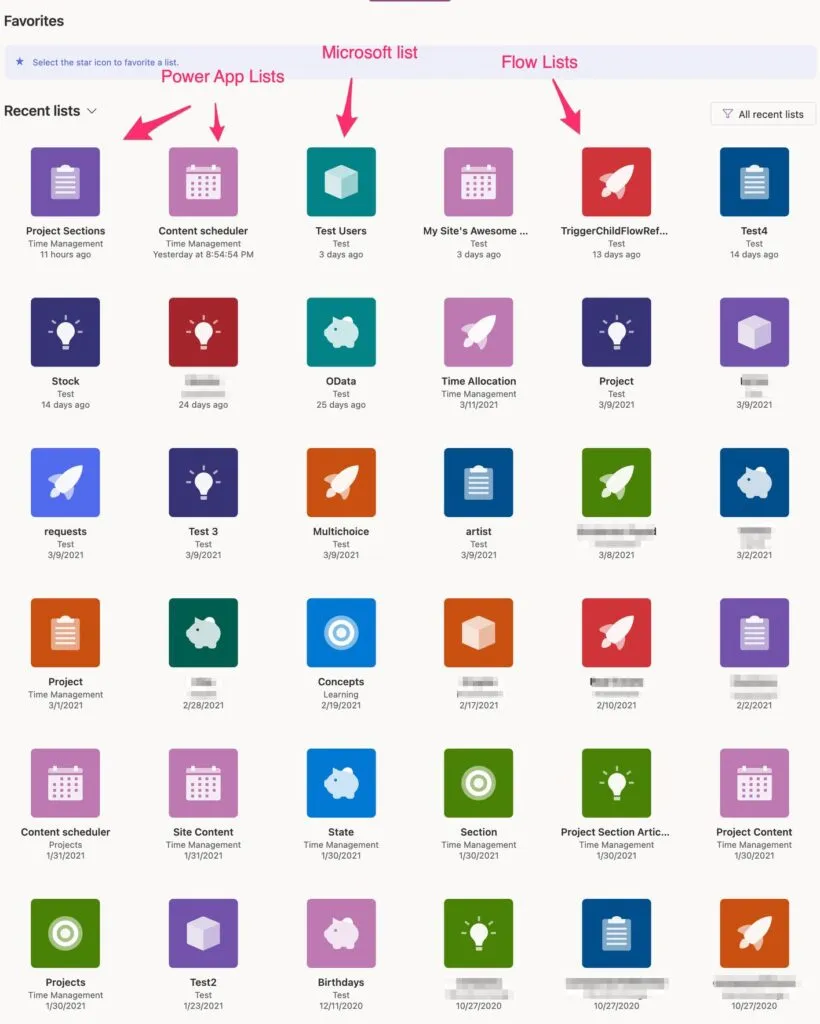 Let’s take a look at how they work—first, something to know. The first time you open Lists, most of the time, you’re not greeted with an empty screen. If you have permissions to access lists in any SharePoint Site, they will show up here but looking a lot better.. Here’s my view: