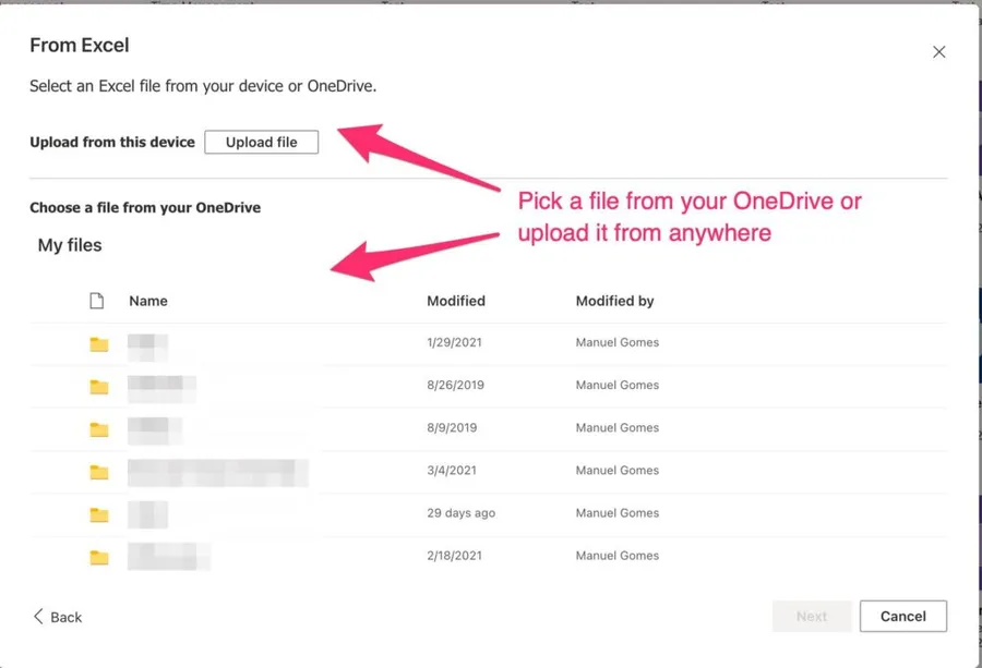 You can select Excel from your OneDrive or upload it from anywhere on your computer.