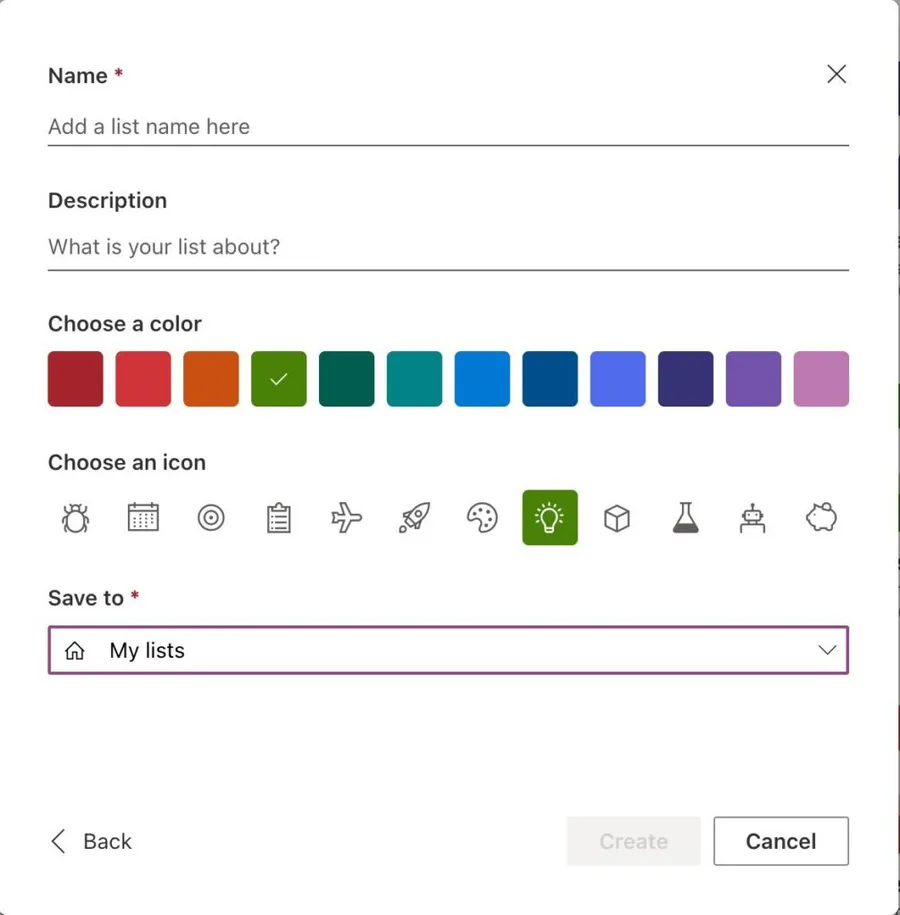 Before, lists needed to be created in a SharePoint Site, but now you can pick “My Lists.” This is extremely useful for users that are not familiar with SharePoint, where they can take full advantage of the tool. A nice touch from Microsoft in usability and lowering the barrier to entry.