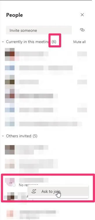 We already have quite a lot of people online, but some people are not present, so we can’t start the meeting. You can give it a nudge by pressing “Ask to join,” and Microsoft Teams warns the person on the other side as it’s a regular call.