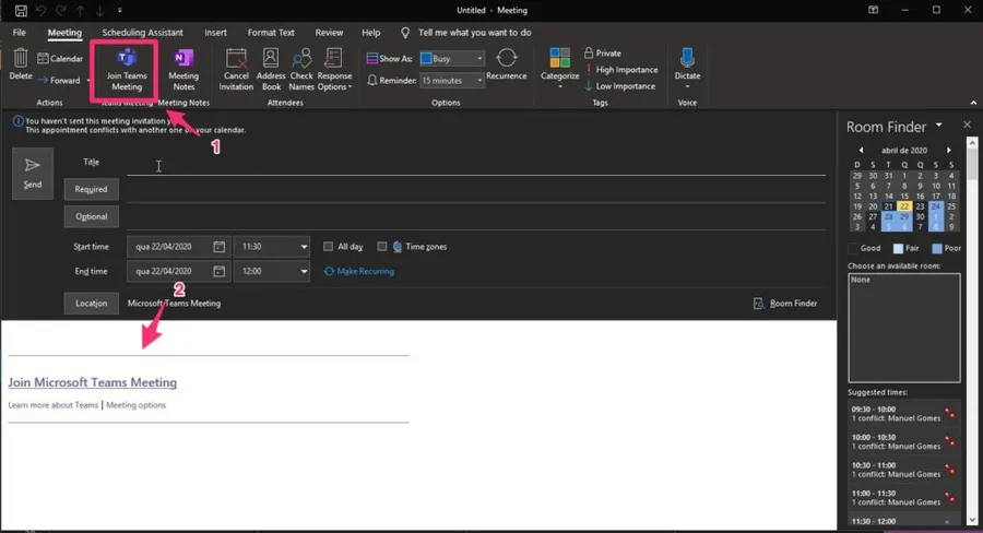 First things first. The meeting should be a recurrent event that should be on everyone’s calendars. In this meeting, you can add the Team’s link in the meeting invitation. Here’s how to do it on Outlook: