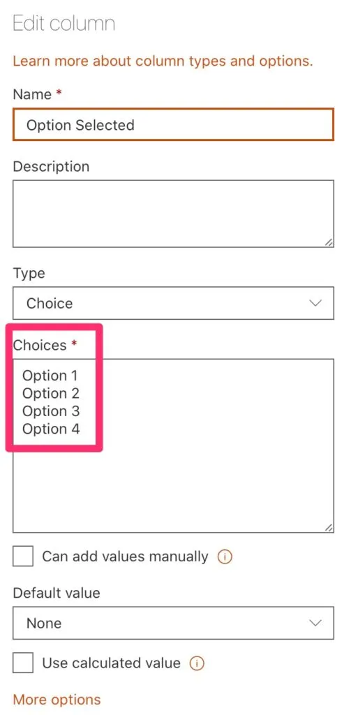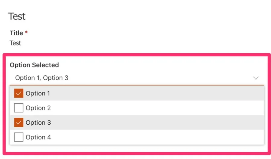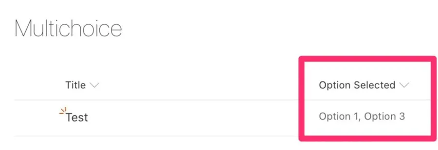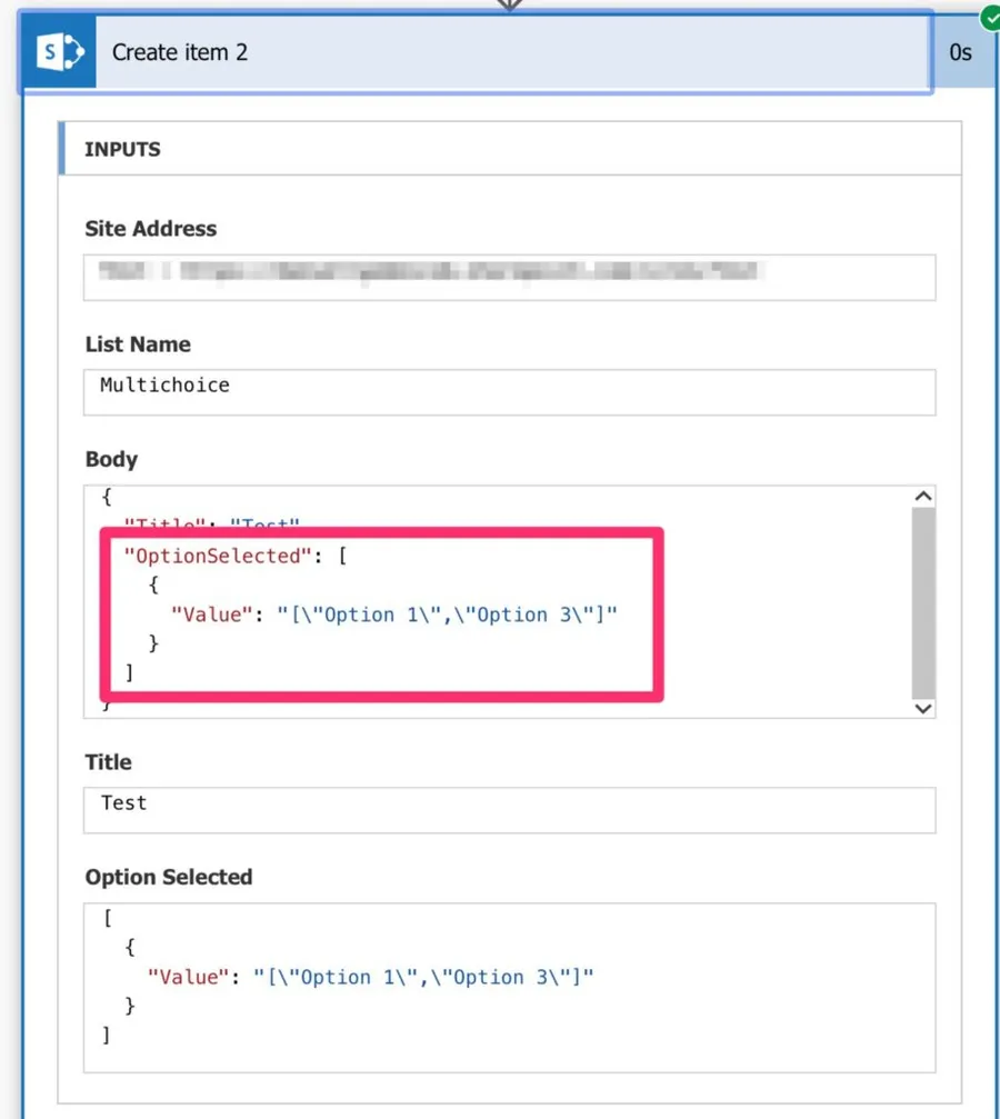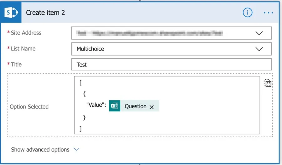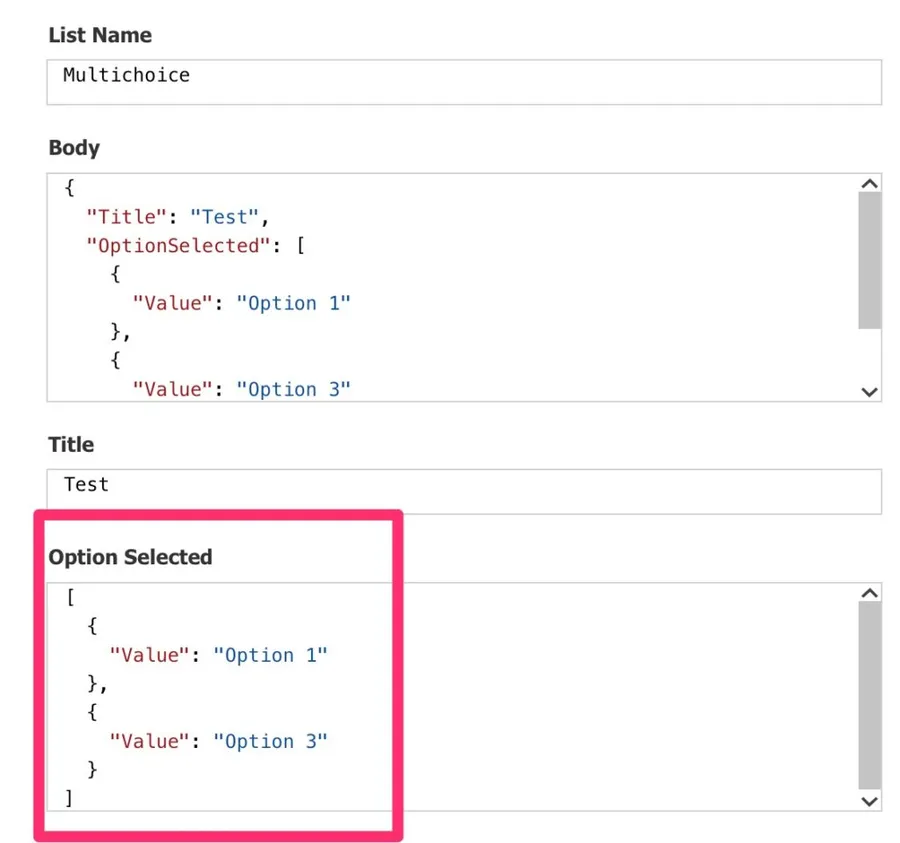I don’t have an option with the value[\"Option 1\",\"Option 3\"]. To understand the issue, we need to know something about Microsoft Forms. Everything that comes as a reply is a String, regardless of you configure in Microsoft Form. For example, if you set a multi-choice Microsoft Form as we did, Microsoft Forms returns a string with an “array” of elements. It'is not usable for us since we need something that Power Automate understands and can send to SharePoint.