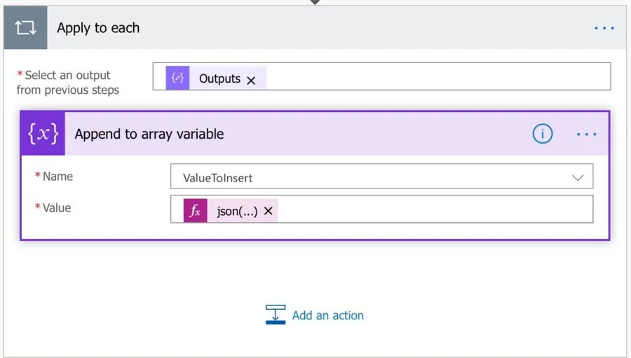 Great walk through, thank you. When I get to the sharepoint entry, the array variable defined "ValueToInsert" is not an option. Only "current item" and "outputs," which are both wrong of course. I double checked all of the entries. Thoughts?