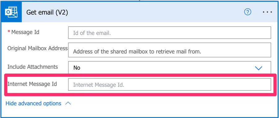 It’s pretty simple how to do it. You provide the “Message Id” of the email you want to get, and Power Automate will return the email and its details, depending on the parameters chosen previously.