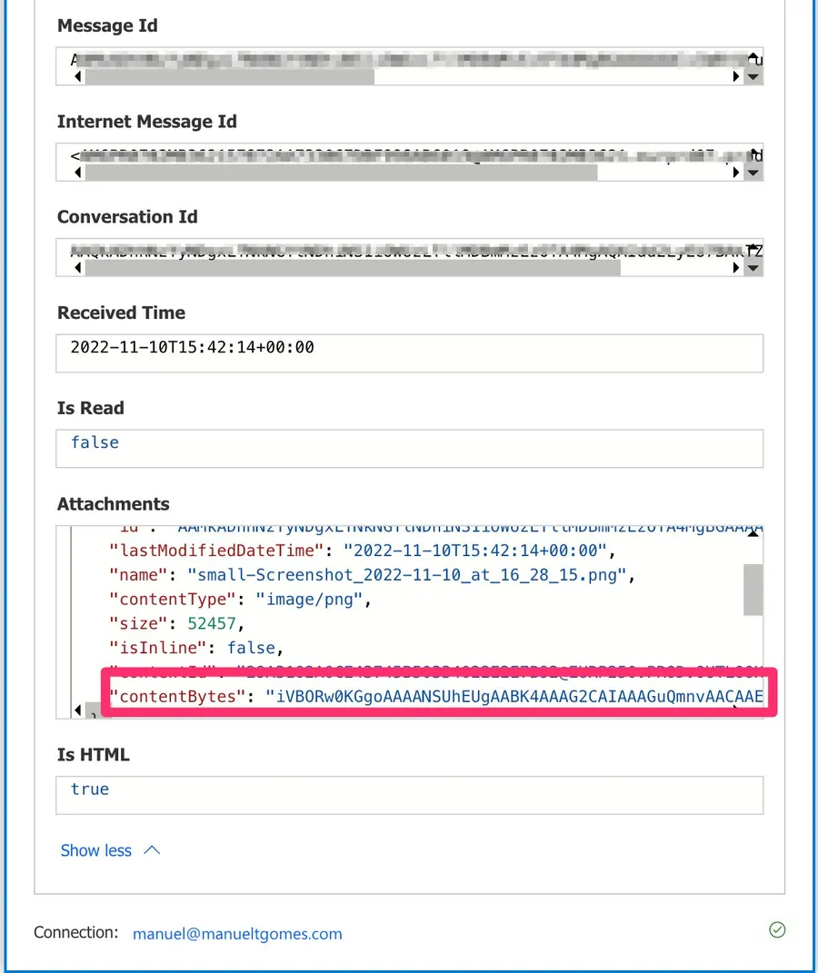 Finally, some actions return “Conversation Id” or even “ID”. Don’t be confused because these are different than the ones we want to get the email. So be sure always to use the “Message ID” when getting an email.