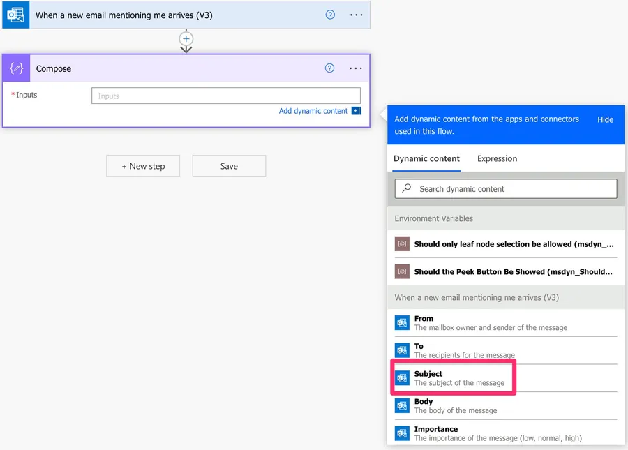 This trigger will fire if the emails mention you in the body, so you’ll have access to all properties of that email in the following actions. For example, here’s how to access the email’s subject using a “Compose” action.