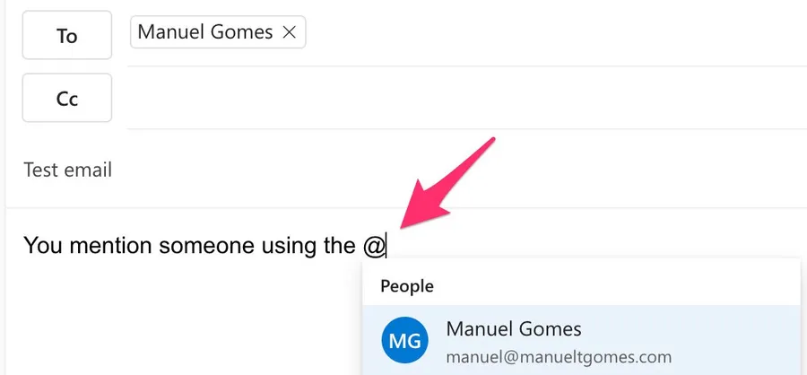 You need to use the “@“ character to display several suggestions that can be people from this email. Please be careful because some email clients will automatically add the email to the list of senders if it’s mentioned, so be sure you want that person to receive the email.