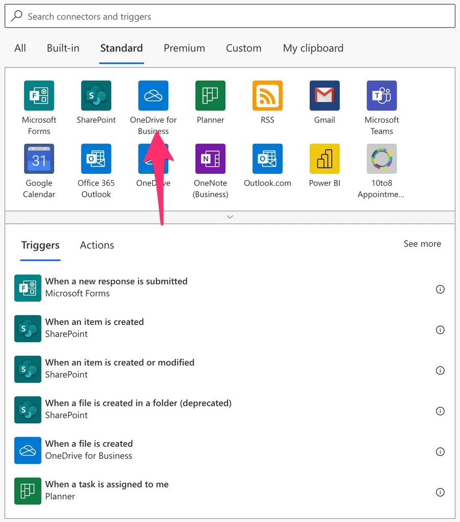 To find it, you can search for OneDrive for Business “For a selected file” trigger or select “Standard”.