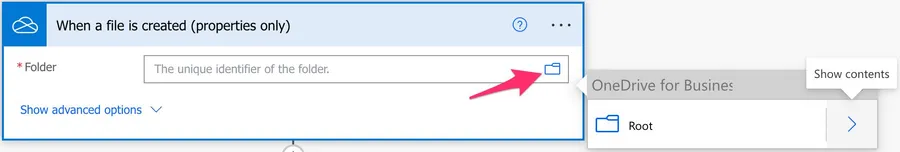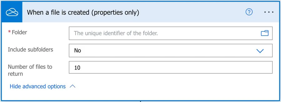 Using it is pretty simple. You point it to a folder that will return the file’s metadata. You need to use the OneDrive for Business "When a file is created" trigger if you want the file. If you know the file identifier, you can include it here, but it’s rare and error-prone to be helpful to do it this way. It’s better to pick the folder from the list of folders in the UI.